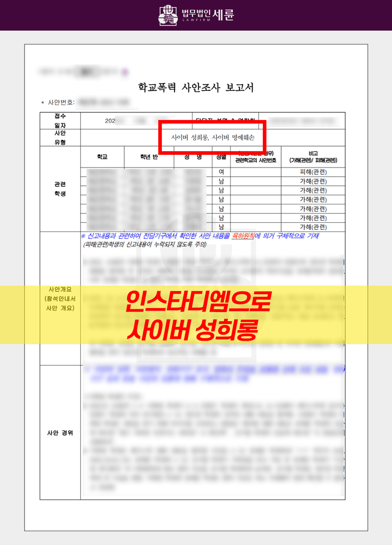 해당 사례와 같은 사이버 학교폭력은 시간과 장소 제약이 없기 때문에 발생수나 심각성이 비교적 높습니다. SNS 특성상 그 행위의 증거들이 대부분 남기 때문에 피해 사실을 입증할 확실한 자료들이 자연스레 마련되는 경우가 많다는 것이 특징이기도 한데요. 따라서 피해 관련 학생이라면 피해 사실을 입증하는 데 있어 더욱 수월할 수 있지만, 가해 관련 학생이라면 처벌 수위가 높아지지 않도록 신중한 대응책을 마련해야 합니다.