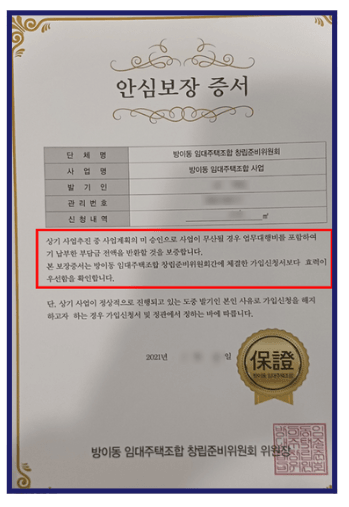 최동욱 변호사의 검토에 따르면, 방이동 임대주택조합은 발기인들에게 "사업계획이 미승인될 경우 납부한 부담금 전액을 반환한다"는 내용의 <안심보장증서>를 교부했습니다. 이는 지역주택조합에서 사용하는 전액환불 약정서와 유사하며, 많은 법원에서 협동조합형 민간임대주택의 <안심보장증서>는 법적 효력이 없고 무효라고 판단한 바 있습니다.
