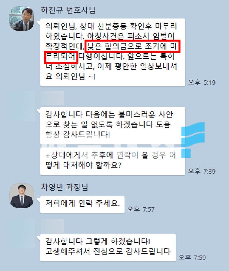 변호인은 합의서 작성까지 세심한 조력을 드렸고 결과적으로 낮은 금액으로 원만한 합의에 이를 수 있었습니다.