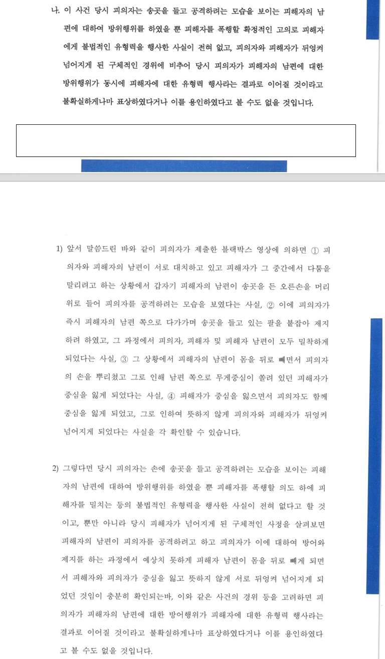 의뢰인분께서 이미 경찰 조사를 받고 오셨고 담당 수사관이 곧 처분을 하겠다는 상황이었기 때문에 가능한 빠르게 변호인의견서를 작성하여 제출하였고, 의뢰인분께서 제공하여 주신 블랙박스 영상을 1초 단위로 쪼개어 분석하고 이를 바탕으로 당시 '피의자(의뢰인)는 송곳을 들고 공격하려는 모습을 보였던 상대방 남성을 제지하는 과정에서 중심을 잃고 상대방 여성과 함께 넘어졌던 것일 뿐, 상대방 여성을 고의로 밀친 사실이 없다'는 점을 의견서를 통해 강하게 주장하였습니다.