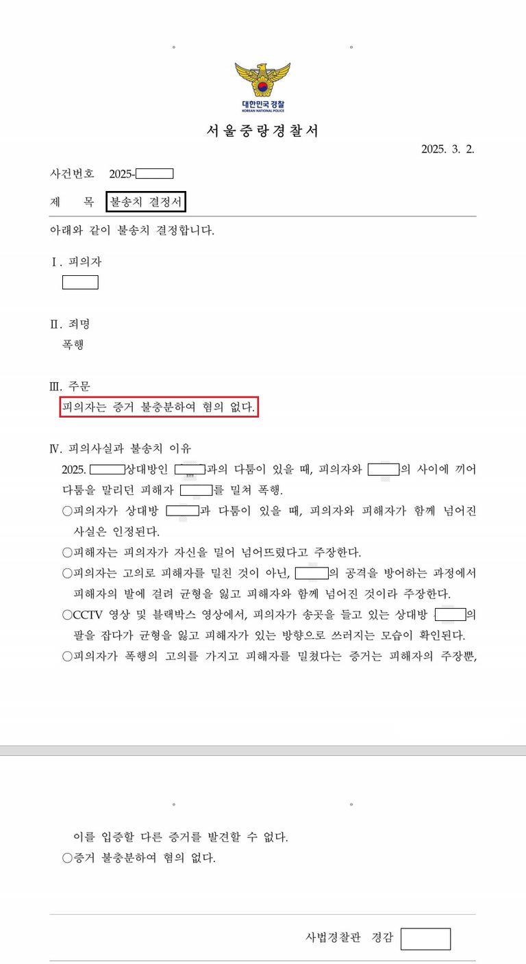 이 사건 담당 수사관은 변호인의 의견을 받아들여 '피의자가 폭행의 고의를 가지고 피해자를 밀쳤다는 증거는 피해자의 주장뿐, 이를 입증할 다른 증거를 발견할 수 없다'는 판단을 하였고, 의뢰인에 대하여 불송치(증거불충분) 결정을 하였습니다.