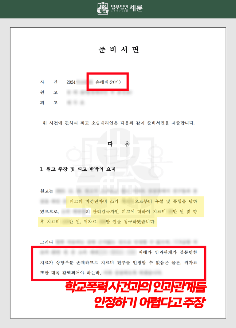 이제 어떤 대처법으로 원고 측에서 청구하는 금액을 대폭 감액할 수 있는지 구체적으로 살펴보도록 하겠습니다. 우선 원고 측과 합의를 시도해보는 방법을 고려해보셔야 합니다. 합의를 통해 합의금을 지급하고 원고가 민사소송을 취하하도록 하여 더이상의 법적 분쟁없이 사건을 종결시키는 것인데요. 그런데 앞서 말씀드린 사례와 같이 양측이 합의할 의사가 없다면 상대방의 주장에 철저하게 반박하거나 반성하는 태도를 보여야 합니다. 이 때 쟁점은 피해 사실과 학폭과의 인과관계를 입증하는 것이 되는데요. 다른데서 다쳐와서는 학교폭력 가해자에게 모두 뒤집어 씌우거나 불필요한 검사비까지 지급해야 하는 억울한 일은 없어야 하기 때문입니다.