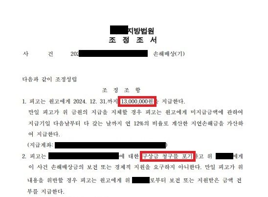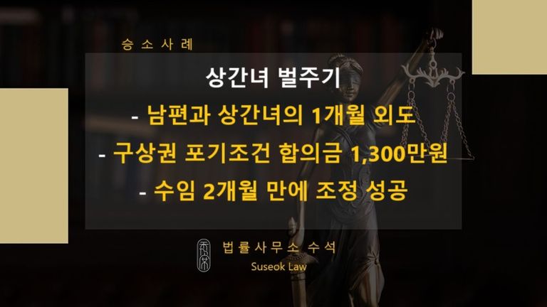 불륜기간 1개월의 짧은 시간에도 불구하고 위자료 1,300만원을 받아내는데 성공합니다. 게다가 상간녀가 남편에게 구상권을 청구할 수 없도록 이를 합의서의 항목에 넣었습니다.