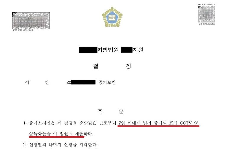 법률사무소 수석은 수임한지 하루만에 CCTV 증거보전 신청을 접수하였습니다. 법원이 까다롭게 보정을 명하였으나 당황하지 않고 즉시 증거를 보강하였습니다.