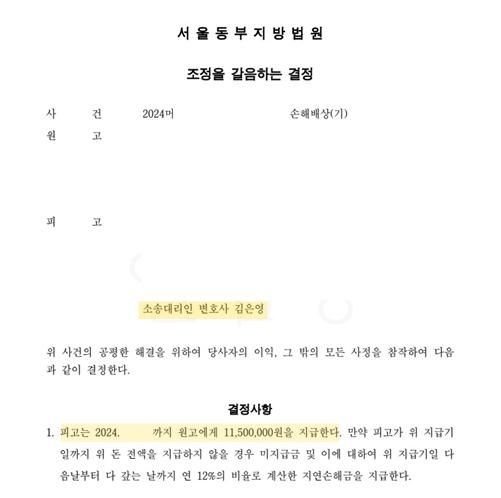 이에 재판부에서 사건을 조정절차로 회부하였고, 조정기일 간 원고 측에서 원하는 위자료와 간극이 있었으나 강제조정 결정(조정을 갈음하는 결정)으로 위자료 총 1,850만 원 감액하면서 사건 종결하였습니다.