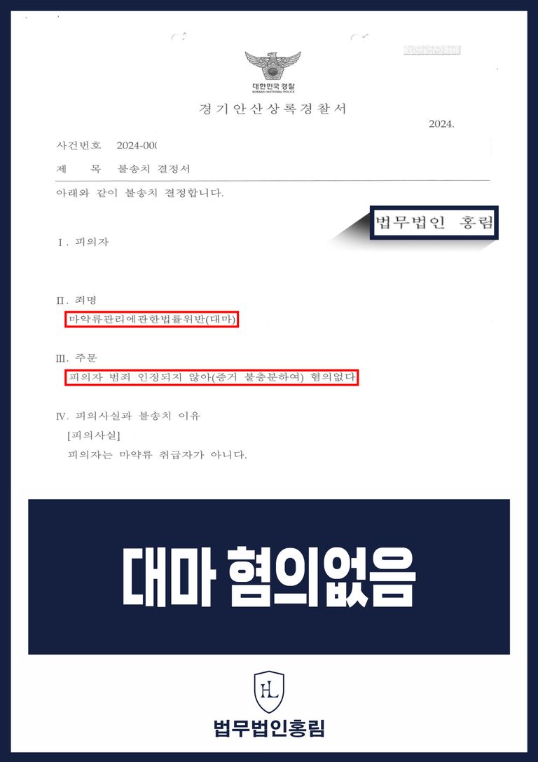 이에 따라 경찰은 "피의자 범죄 인정되지 않아(증거 불충분하여) 혐의없다"는 불송치 결정을 내렸습니다. 이로써 A씨는 대마 흡입 혐의에서 벗어나게 되었으며, 형사사건 기록에도 피의자 혐의없음으로 남게 되어 향후 사회생활에 부담을 주는 기록도 남기지 않게 되었습니다..