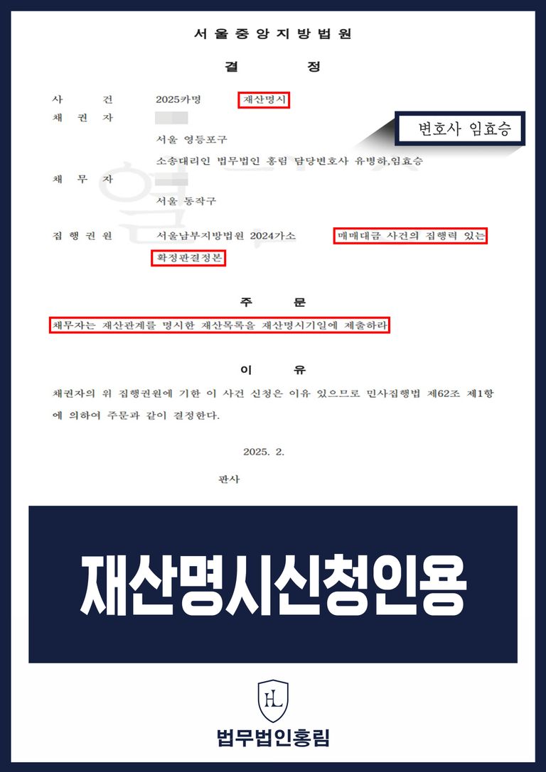 이에 본 법무법인은 의뢰인 A씨를 대리하여 강제집행을 원활하게 진행할 수 있게 돕기로 한 바, 재산발견을 하기 위해 민사집행법 제61조에 의거하여 채무자에 대한 이 사건 재산명시신청을 진행할 수 있도록 조력을 가하였습니다.