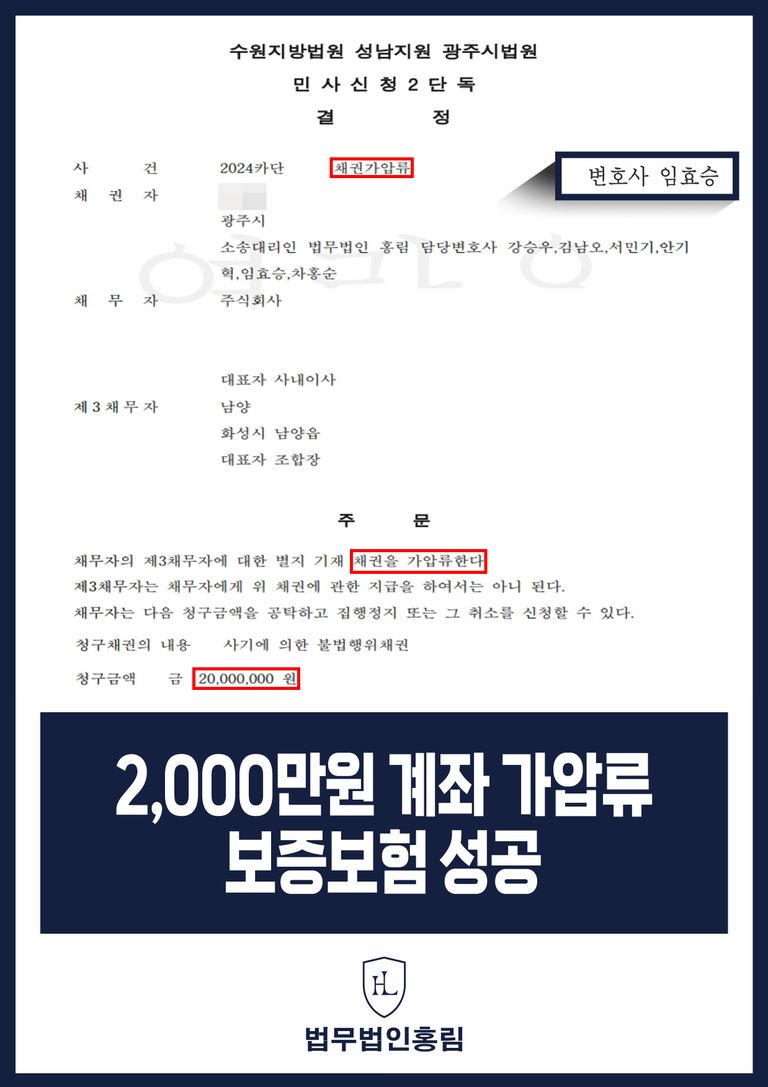 그 결과 법원에서는 본 변호인의 주장을 받아들여 통장 가압류(전액 보증보험)하였습니다.