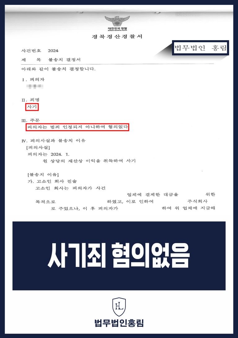 그 결과 경찰 측에서는 변호인의 의견을 받아들여 사건을 '불송치(혐의없음)'로 종결하였습니다.