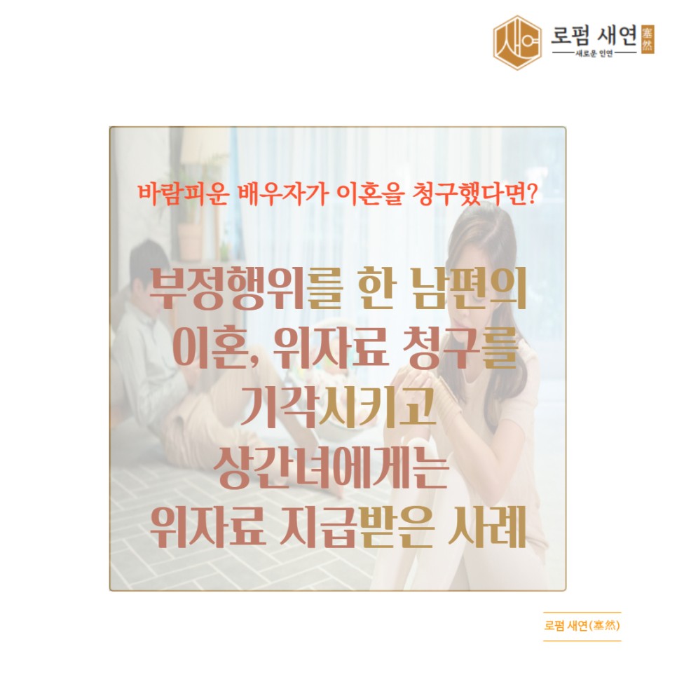 그래서 이번에는 부정행위를 저지른 남편의 이혼 및 위자료 청구를 기각시키고, 상간녀를 상대로는 위자료 청구소송을 제기하여 위자료를 인정받은 사례를 소개해드리고자 합니다.