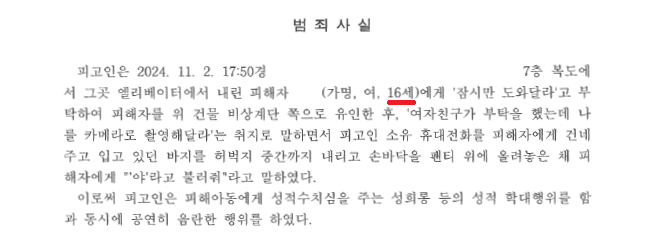 그런데도 A씨는 2024. 11. 2. 17:50경 학원이 많은 건물로 들어가 배회하며 대상을 물색하다가, 엘리베이터에서 내린 16세 여중생 B양을 발견하고 비상계단 쪽으로 유인한 다음, B양에게 여자친구가 촬영을 부탁했다는 핑계를 대며 핸드폰을 건네주고는 입고 있던 바지를 허벅지 중간까지 내려 손바닥으로 팬티 위를 만졌습니다.