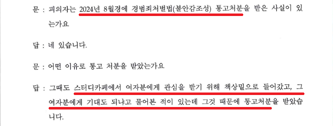 A씨는 2024. 8.경 스터디카페에서 여성의 관심을 받기 위해 책상 밑으로 들어가고 여성에게 기대도 되냐고 물어보았다가 경범죄처벌법위반(불안감조성)죄로 통고처분을 받은 전력이 있었습니다.