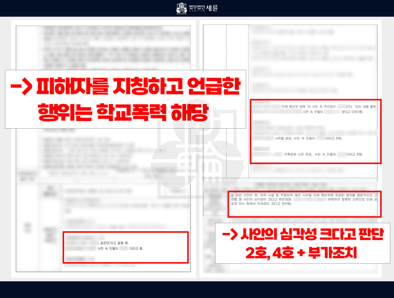 반면에 2호와 4호 처분 및 부가 조치까지 받은 학생들은 피해자를 언급하고, 사실과 다른 헛소문을 퍼뜨림으로써 피해자에게 모욕감과 성적 수치심을 불러일으켰습니다. 즉, 학폭위 심의 위원들은 자체 심의로 정한 처분 기준으로 가해학생들을 구분하여 최종 조치를 내린 것이었습니다.