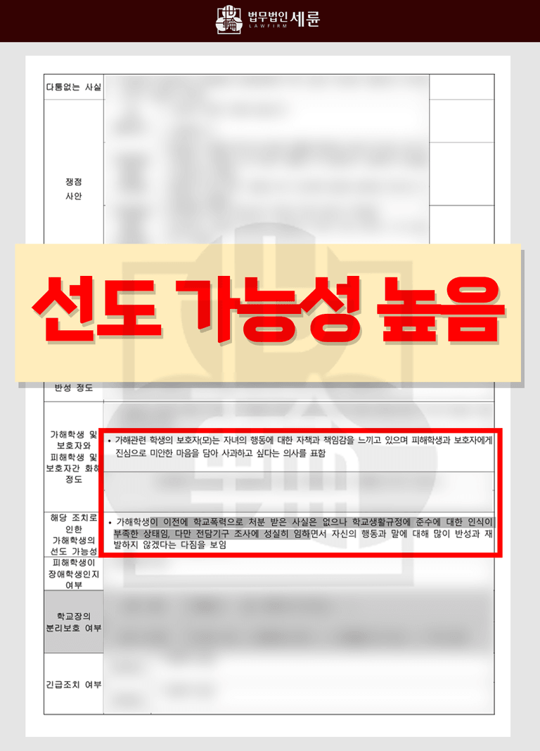 해당 사례의 사안이 꽤 심각해보였음에도 가해학생은 교내봉사와 접근금지 조치를 받고 사건이 마무리 되었습니다. 심의위원들은 우선 가해학생이 이전에 학교폭력으로 처분 받은 전력이 없다는 점을 확인했습니다. 그 사실은 즉슨 가해학생이 자신의 잘못된 행위를 깨우친다면 재발 방지 가능성이 있다는 것이죠. 또한 가해학생은 ▲전담기구 조사에서 성실한 자세로 임했고, ▲피해자에게 사과하고 반성하면서 ▲자신의 잘못을 되풀이 하지 않겠다는 확고한 다짐까지 보였습니다.