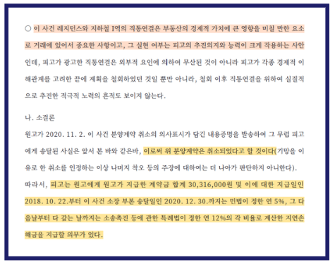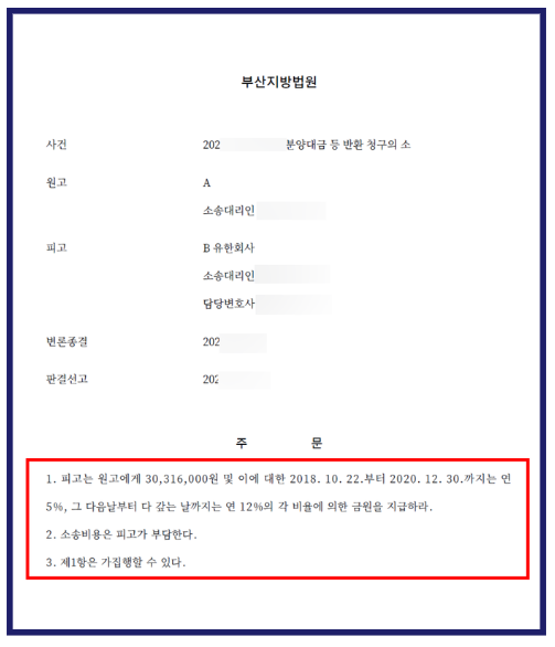 결국 부산지방법원은 이 사건 분양계약이 피고의 기망행위로 체결된 것이라 보고, 분양계약을 취소하고 피고는 원고가 납부한 계약금과 그에 대한 지연이자를 반환하라고 판결하였습니다.