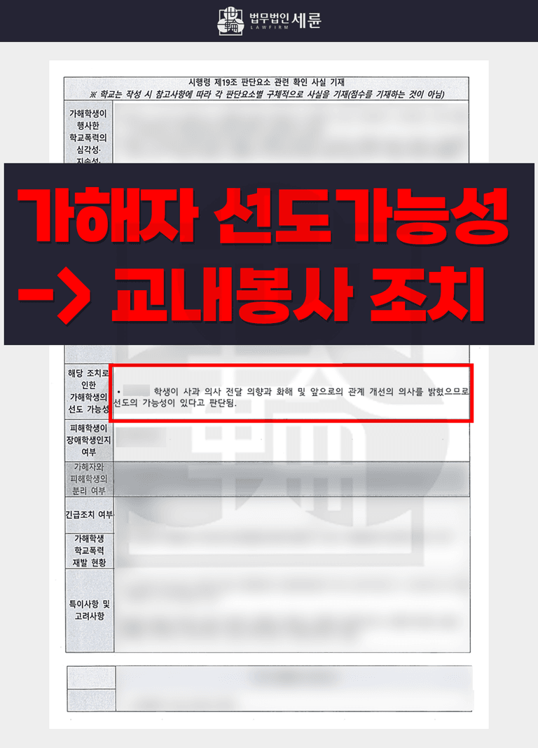 최종적으로 가해학생에게는 교내봉사 조치, 방관 학생에게는 조치없음 결정이 내려졌습니다. 위에 설명드렸듯이, 방관 학생을 신고한 피해자 측의 주장은 ▲확실한 증거가 없었고 ▲방관 학생은 공모나 적극적인 가담을 한 적이 없었기 때문에 혐의가 없다고 판단했습니다. 폭행과 괴롭힘을 행사한 가해 학생에 대하여는 행위의 지속성을 판단하는 것이 핵심이었습니다. 그러나 피해 학생 측이 제출한 멍과 상처 사진에는 날짜와 사건 당시에 대한 구체적인 설명이 배제되어 있었기 때문에 가해 행위가 지속적으로 행해졌다는 주장을 뒷받침하기에 불충분하였습니다. 또한 가해 학생은 신체 폭력 사실 인정 후 피해자에게 사과하고 관계를 회복하고 싶다는 의사를 내비쳤다는 점을 참작하여 교내봉사가 적절하다고 판단한 것입니다.