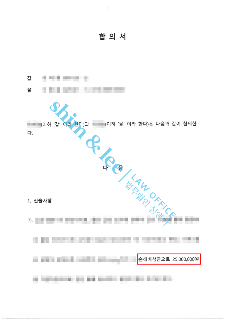 - 가해자가 사회초년생으로 아직 경제력이 없는 상황이었기에, 합의금은 가해자의 부모님이 마련해야 하는 상황이었습니다. 가해자 부모님은 1,000만 원의 합의금을 제시했으나, 대표 변호사님은 여러 차례 합의 조건과 금액을 두고 의견을 주고받았고 결국 형사 고소 가능성을 우려한 가해자가 합의금 2,500만 원을 제시하면서 합의가 성사되었습니다.