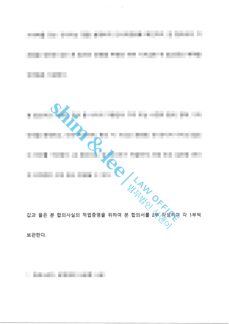 - 심앤이는 의뢰인의 요청 조항을 모두 반영하는 것은 물론, 의뢰인에게 유리한 조항들을 추가해 합의서를 작성하였으며, 가해자의 자필 사과문도 함께 받아 의뢰인께 전달해드리며 사건을 의뢰인이 원하신 방향으로 잘 마무리할 수 있었습니다.