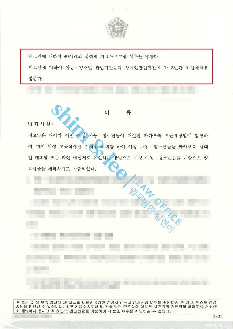 - 최종적으로 가해자는 징역 4년, 성폭력 치료강의 40시간, 취업제한 5년을 선고받고, 범죄에 사용한 휴대폰 및 유심을 몰수당했습니다. 가해자는 범행을 인정하고, 합의를 했음에도 미성년자를 대상으로 성착취물을 수백 개 제작하여 실형선고를 피할 수 없었고, 지금도 실형을 살고 있습니다.