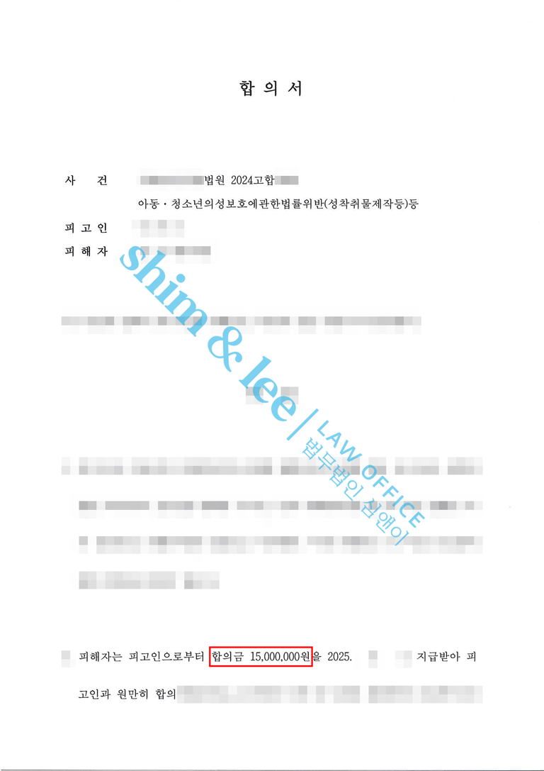 - 결국 가해자는 가진 재산을 전부 처분하고 1500만 원까지 증액하여 합의를 제안해왔습니다. 이에 대표 변호사님은 가해자의 출소 이후 2차 가해를 방지하기 위해 촬영물 미소지, 피해자 인적사항 공개 금지, 비밀유지, 접근 및 보복금지 등의 부가 조항을 포함한 합의서를 작성하였고 성공적으로 합의를 마무리하였습니다.