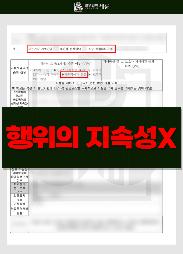 결과적으로 과반수의 학생이 지속적인 학교폭력에 대하여 의문을 제기하였기 때문에 행위의 지속성은 인정하기 어려웠습니다. 즉, 신체폭력이 있었던 것은 사실이지만 서로 말다툼을 하다가 일어난 사건이고, 목격자들의 진술에 따르면 행위의 지속성이 없다고 판단되어 3호 교내봉사 조치로 마무리되었습니다.