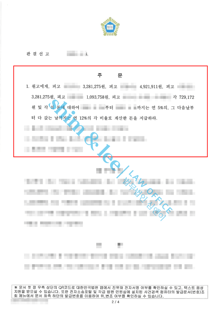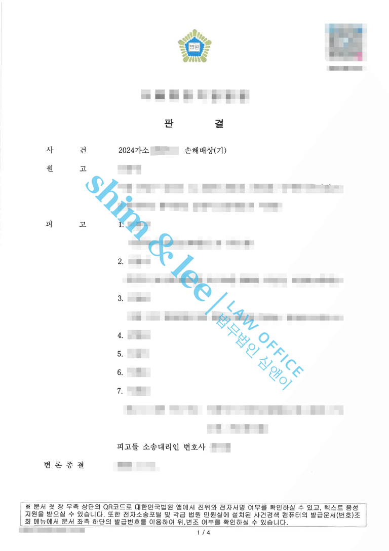 - 의뢰인은 역시 전문가의 도움을 받는 것이 가장 올바른 방법임을 실감하신다며, 심앤이의 정확한 사건 파악 능력과 철저한 전략 덕분에 목표했던 손해배상금보다 훨씬 더 많은 금액이 인용된 결과에 놀라움을 금치 못하셨습니다.