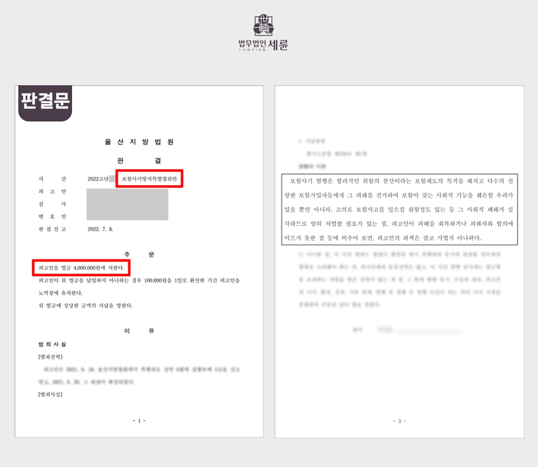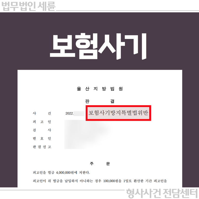 이 사건에서 피고인은 보험사기방지특별법을 위반하였음을 이유로 법원은 벌금 4,000,000원의 형을 내리게 됩니다. 법원은 보험사기의 범행으로 사회적 폐해가 심각하다는 점 등을 양형의 근거로 들고 있는데요. 단지 보험회사를 속였다는 사실 뿐만 아니라, 선량한 시민을 다치게하거나 보험가입자들의 보험금을 올리게 하는 폐단이 발생함을 의미한다고 볼 수 있습니다.