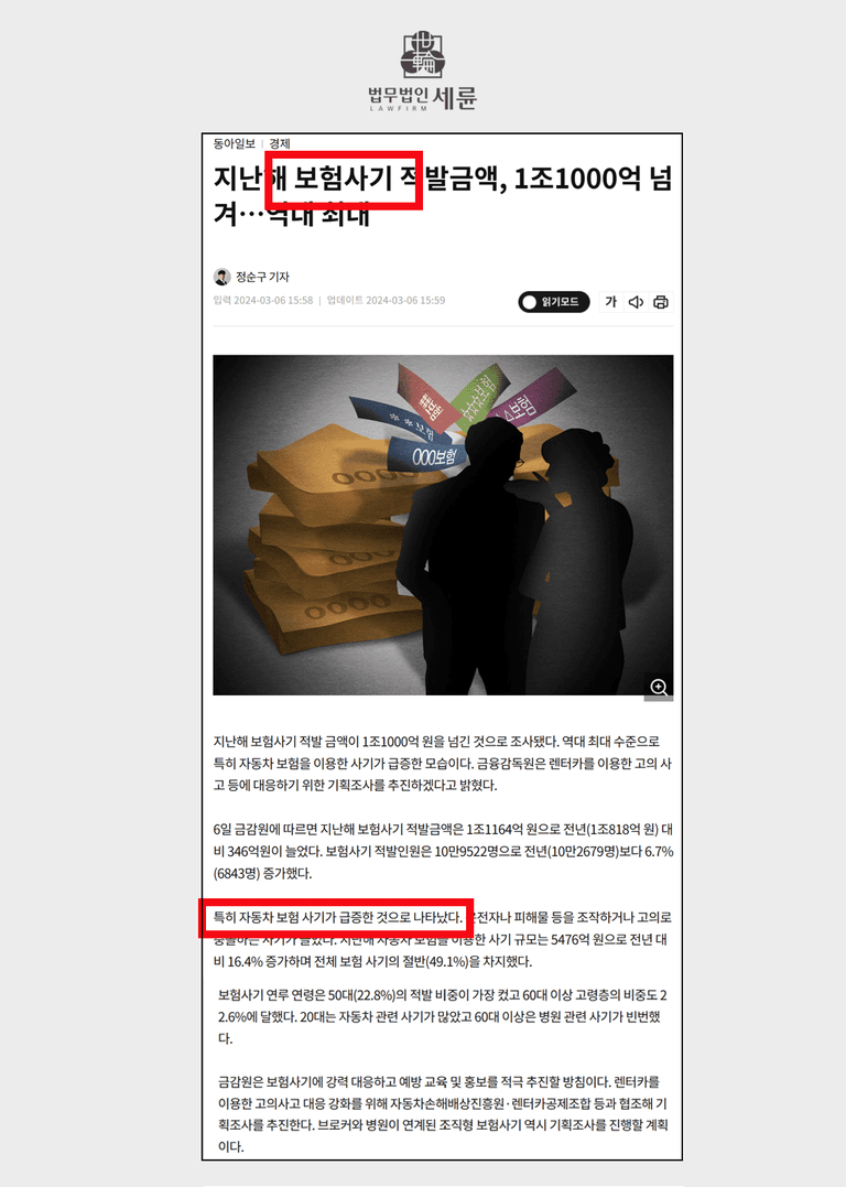 금융감독원의 조사에 따르면 보험사기로 인해 한해 6조가 넘는 금액이 누수되고 있다고 합니다. 그만큼 보험사기로 인한 사회적 손실이 크다는 뜻이겠죠. 최근 '교통사고가 났는데, 보험사기가 의심된다'거나 '사고가 나서 진짜 치료를 받은건데, 보험사기가 의심된다며 손해배상청구를 해왔어요' 라는 상담 요청이 부쩍 늘고 있습니다.