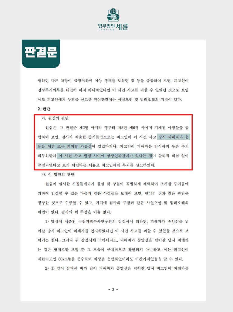 앞서 소개해드린 실제사례의 경우, 원심에서 A씨가 당시 B씨와 충돌을 예견 또는 회피할 가능성이 없었다고 보아 무죄를 선고하였었습니다. 피고인의 과실과 해당 교통사고이 인과관계가 인정되지 않은 것이죠.