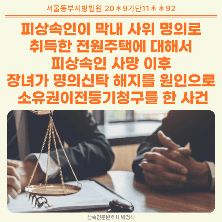 이후 피상속인 사망이후 장녀인 원고는 피상속인이 둘째사위 명의로 취득한 전원주택과 장남 명의로 매수한 다가구주택은 피상속인이 각 명의신탁한 재산이라고 주장하면서 명의신탁 해지를 원인으로 한 소유권이전등기 청구소송을 제기한 사안입니다.