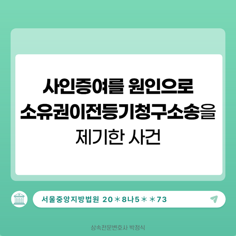 피상속인은 생전에 피상속인 소유로 되어 있는 아파트 1채에 대하여 원고에게 사인증여하겠다는 말씀을 자주 하였고, 원고도 피상속인의 사인증여 의사표시에 승낙의 의사표시를 하였다는 이유로, 피상속인이 사망하자마자 부친과 나머지 자녀들을 상대로 소유권이전등기청구를 한 사건입니다.