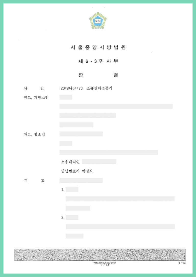 ② 이 사건 소송 진행 도중에 소송당사자인 부친이 사망하였으므로, 원고와 다른 피고들이 부친의 소송을 수계하여 소송이 진행되어야 하고, 부친의 사망으로 인하여 부친의 상속분에 해당하는 3/11지분 중 원고가 상속하는 3/44지분에 대해서는 당사자 지위의 혼동으로 소송이 종료된 것으로 인정하였습니다.