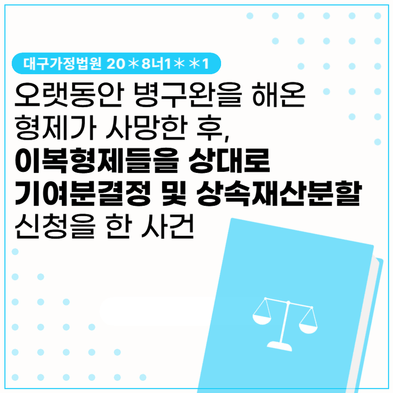 청구인은 어렸을 때부터 병을 앓아 결혼도 하지 못한 언니인 피상속인을 20년 이상 보살펴 온 반면, 상대방들은 피상속인의 이복오빠의 자녀들로서 상대방들과는 전혀 연락조차 하지 않고 지내왔습니다. 피상속인인이 사망한 이후 청구인이 상대방들을 상대로 기여분결정 및 상속재산분할심판 조정싱청을 제기한 사안입니다.
