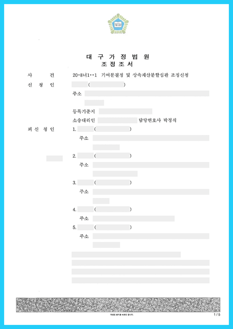 ③ 이에 재판부에서는 청구인의 기여분을 50% 이상으로 인정하고, 피상속인의 재산을 모두 청구인이 단독으로 분할받는 대신 상대방들에게 일정 금액을 지급하는 방식으로 분할하는 것으로 조정이 이루어진 사안입니다.