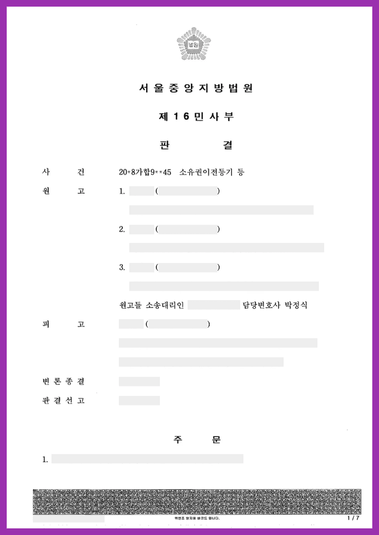 이후 원고는 주위적으로 이 사건 이행약정서에 기재된 이 사건 부동산에 관한 협의분할 내용이 원고들의 의사와 다르게 작성되었고, 피상속인이 사망하기 전에 한 상속포기로서 무효이며, 부친이 사망하기 전에 이 사건 부동산에 관하여 원고들에게 이전해 주라는 유언을 하였다고 주장하면서 각 해당 지분에 관하여 진정명의회복을 원인으로 한 소유권이전등기 청구를 하였습니다.