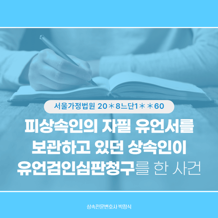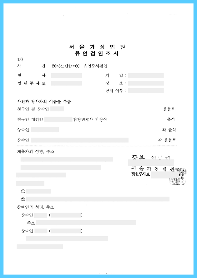 유언자 망인은 주소지에서 자필로 유언서를 작성하여 유언자의 장녀인 청구인에게 보관하도록 하여 청구인이 이를 보관하고 있던 중, 이후 유언자가 사망하여 검인을 신청하기에 이르렀습니다.