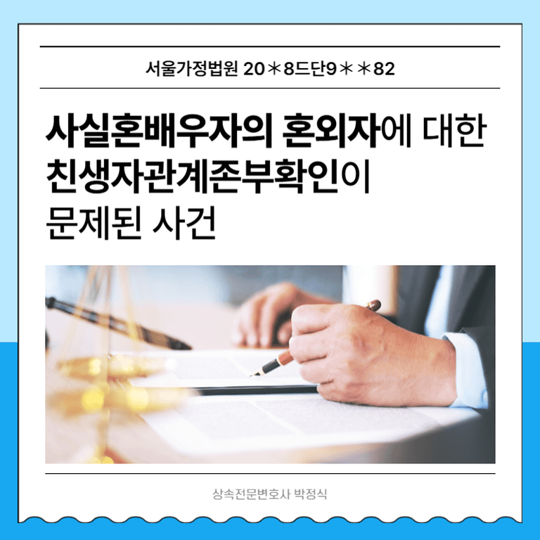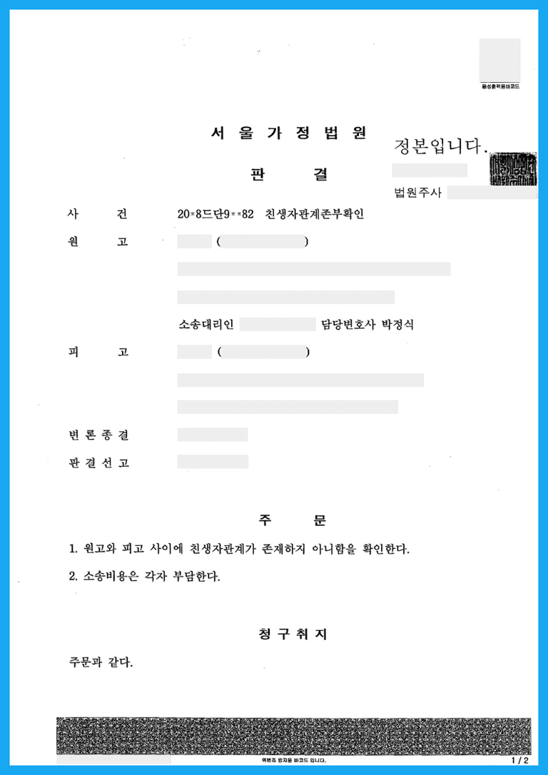 원고의 남편이던 망인이 다른 여성과 사이에서 혼외자로 피고를 낳았는데, 출생신고 당시 원고를 피고의 생모인것처럼 기재하여 이 사건 소 제기 시까지 원고의 가족관계증명서에 피고가 원고의 자녀로 등재되어 있었습니다.