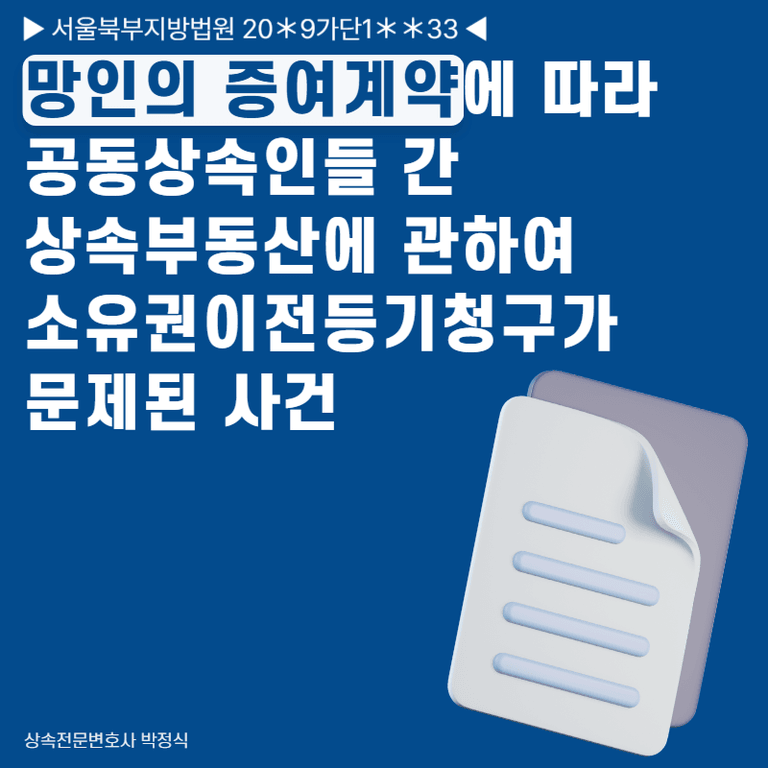 위 망인이 사망함에 따라 이 사건 부동산 1, 2에 관하여 원고 1에게 3/11, 원고 2 및 피고들에게 각 2/11 지분만큼 상속되었습니다. 이에 원고들은 기존의 증여계약 약정을 이유로 피고들에게 이 사건 부동산 1, 2에 관하여 피고들이 상속받은 각 2/11 지분에 대하여 소유권이전등기 청구를 하는데 이르렀습니다.