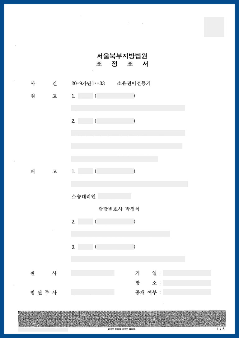 ② 이 사건 부동산 2에 관하여 3/9는 원고 1의, 각 2/9는 피고들의 각 소유로 하는 것으로 조정이 성립하였습니다.