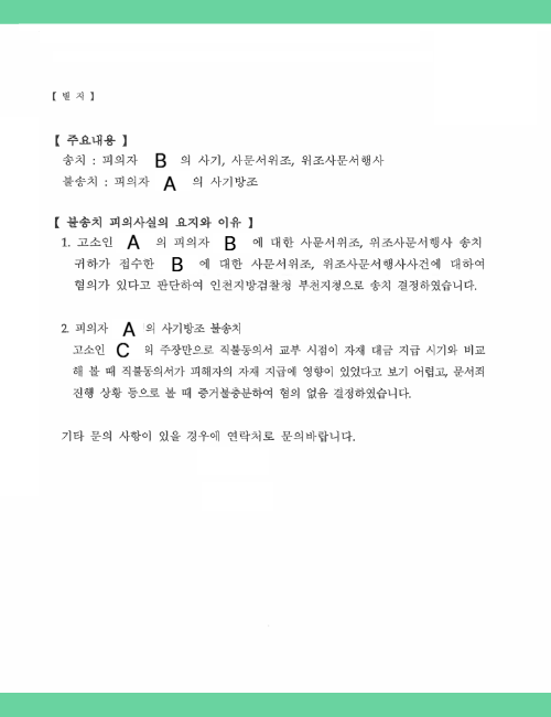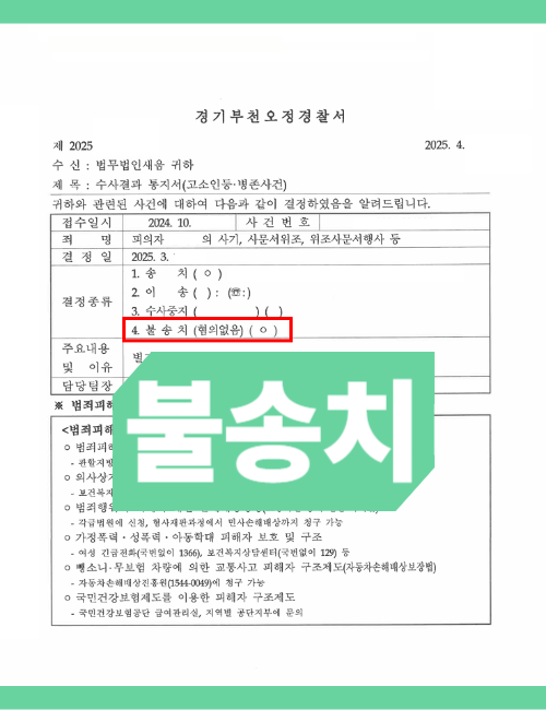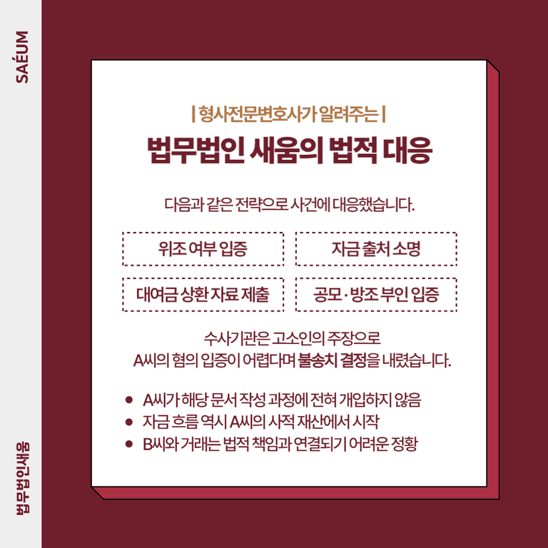 수사기관은 A씨가 해당 문서 작성 과정에 전혀 개입하지 않았고, 거래처인 C씨와도 어떠한 실질적인 교류가 없었으며, 문서의 존재조차 사후에 처음 인지했다는 점을 주목했습니다. 자금 흐름 역시 A씨의 사적 재산에서 시작되었고, B씨와의 금전거래는 법적 책임과 연결되기 어려운 정황이라는 점이 확인되어 결국 불송치 결정이 내려졌습니다.