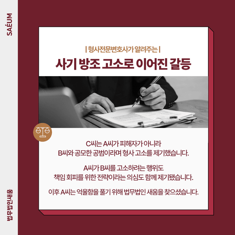 문서는 민사적 문제에서 끝나지 않았습니다. C씨는 A씨가 단순한 피해자가 아니라, B씨와 공모하여 고의로 직불합의서를 작성한 공범이라며 형사 고소를 제기했습니다.