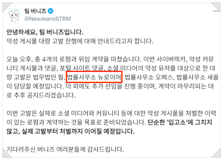 뉴진스 악플 대량 고소 또한 저희가 주도하여 고소를 진행하기도 하였습니다. : )