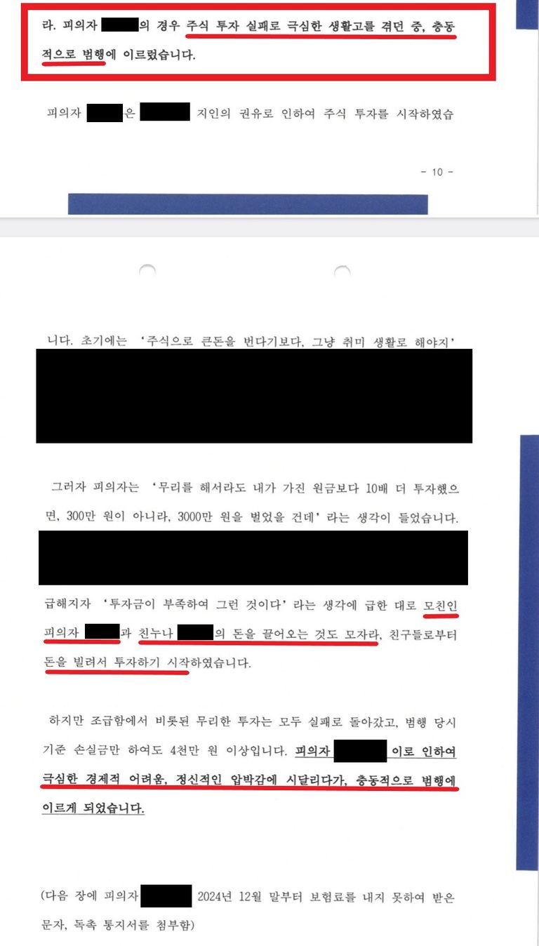 3) A의 경우 주식과 코인 투자 실패로 극심한 생활고를 겪던 중, 충동적으로 범행에 이르렀음