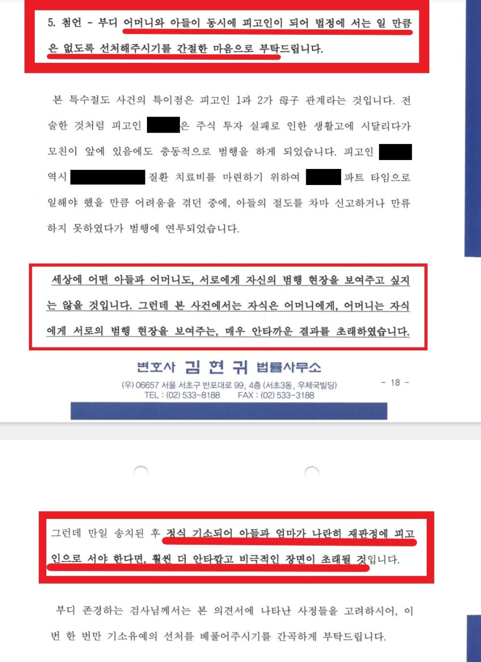 6) 만일 정식 기소될 경우, 아들과 어머니가 나란히 피고인 석에 서야 하는 비극적인 장면이 초래될 것임