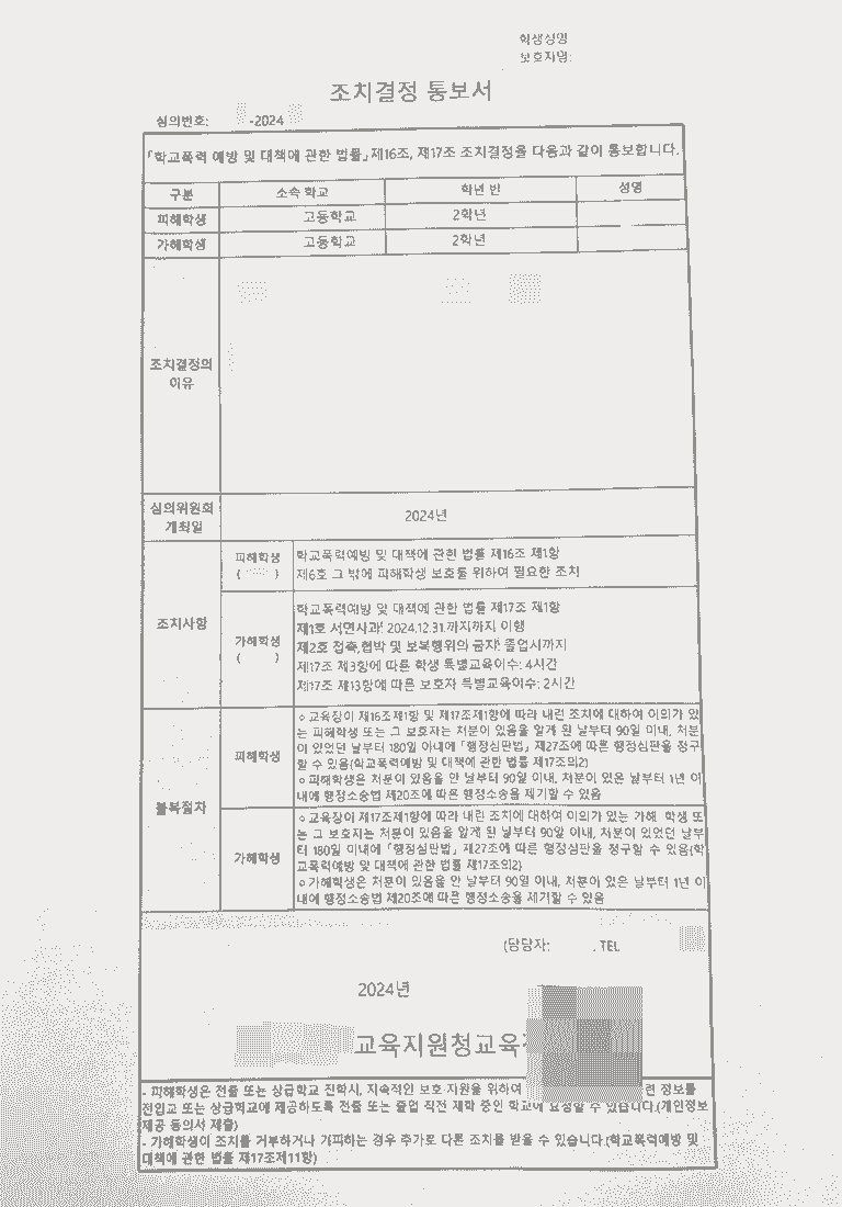 학폭위는 결국 A군에게도 처분을 내리긴 했지만, 1호(서면사과), 2호(접촉·협박·보복금지)라는 가장 가벼운 수준의 조치에 그쳤습니다.