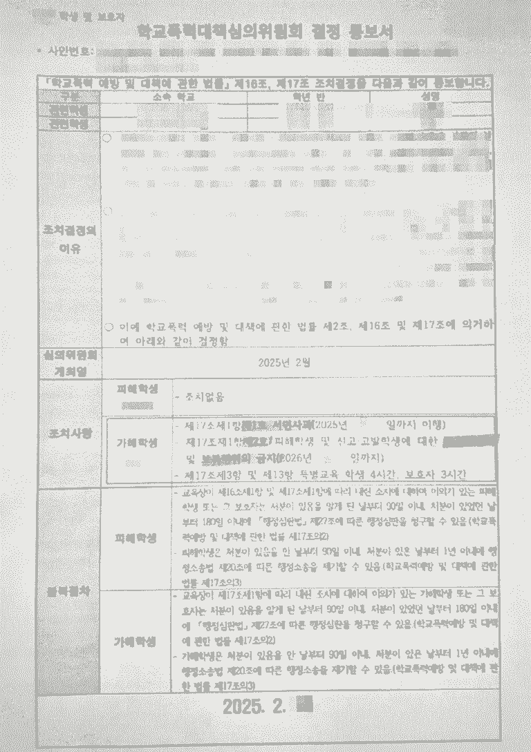 그 결과, 가장 중한 혐의였던 성범죄 방조와 금품갈취, 따돌림 혐의는 모두 벗을 수 있었고, 언어폭력에 대해서만 2호 조치가 내려지는 선에서 사건이 마무리되었습니다.