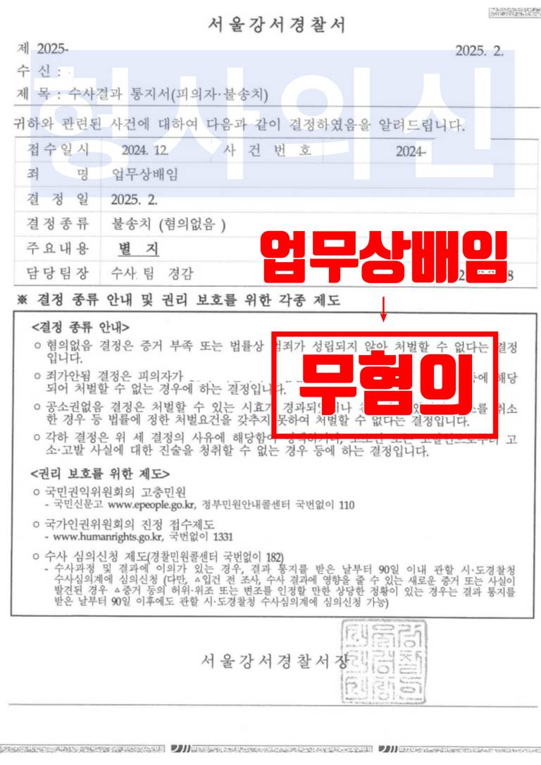 서울강서경찰서의 사법경찰관은 법률사무소 유(唯)의 형사전문변호사의 주장을 받아들여 혐의에 대해 불송치(혐의없음) 처분을 내렸습니다.