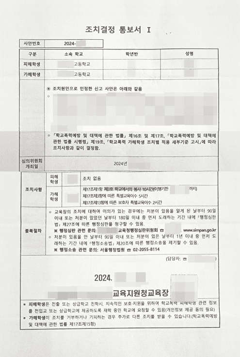 이런 상황에서는 학폭위에서 4호(사회봉사) 또는 5호(특별교육) 처분까지도 예상할 수 있었기에, 조금만 대응이 미흡해도 생기부 기재는 피할 수 없는 상황이었습니다.