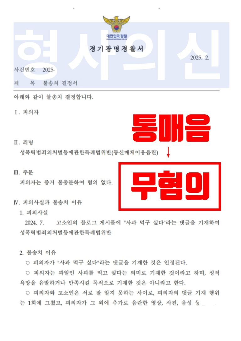 경기광명경찰서의 수사관은 법률사무소 유(唯)의 형사전문변호사의 진술 동행과 변호인 의견서에 제출된 증거자료 등 서면을 보고 무혐의 주장을 받아들여, 의뢰인이 피해자에게 자기 또는 다른 사람의 성적 욕망을 유발하거나 만족시킬 목적으로 범죄사실과 같은 내용을 작성한것으로 보기 어렵다는 이유로 불송치(혐의없음) 처분을 하였습니다.
