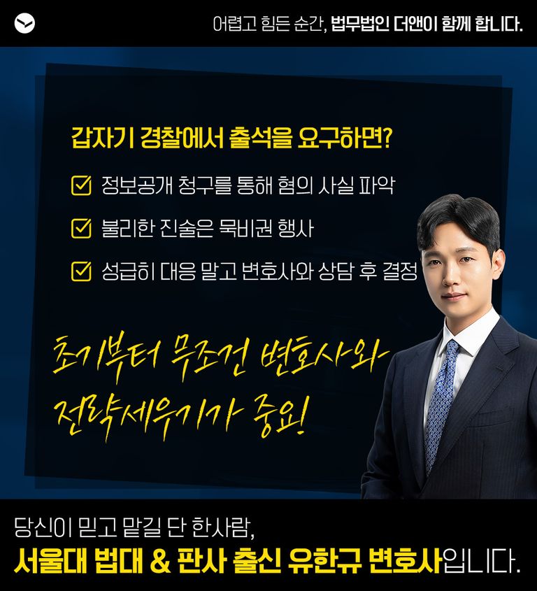 갑작스럽게 경찰서 출석을 요구받더라도 성급히 대응하지 말고, 먼저 자신의 신분과 혐의를 명확히 파악한 뒤, 변호사와 충분히 상담한 후 대응 여부를 결정해야 합니다. 초기 대응부터 전문가의 도움을 받아 체계적으로 대응한다면, 불필요한 불이익을 최소화하고 사건을 유리하게 이끌어갈 수 있습니다.